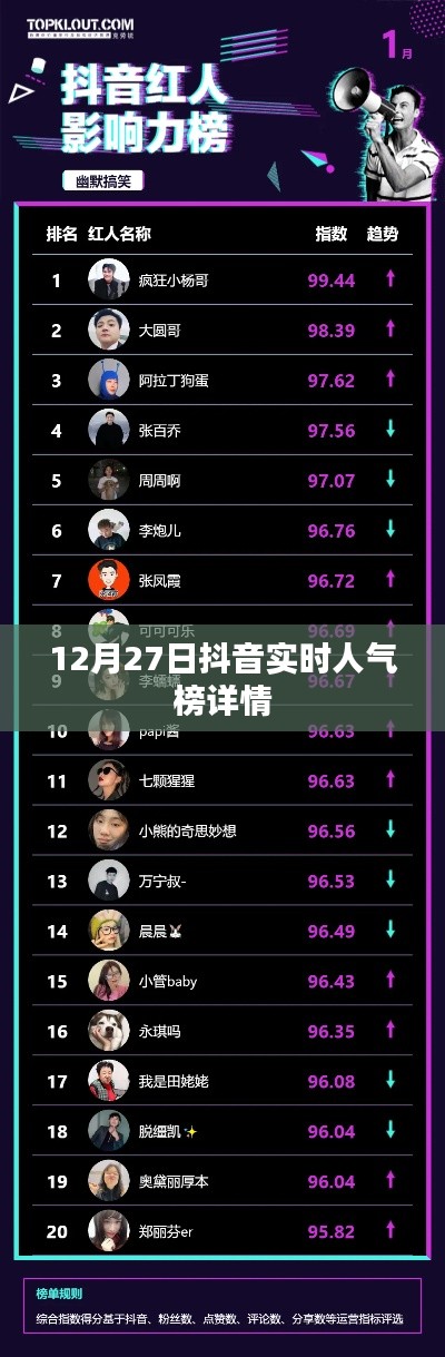 随着科技的飞速发展和智能设备的普及,抖音作为一款领先的短视频社交平台,已经成为人们生活中不可或缺的一部分,每日都有数以亿计的活跃用户在抖音上分享自己的生活和创意,形成了一个庞大的内容生态,本文将为您详细介绍12月27日抖音实时人气榜的详细情况。